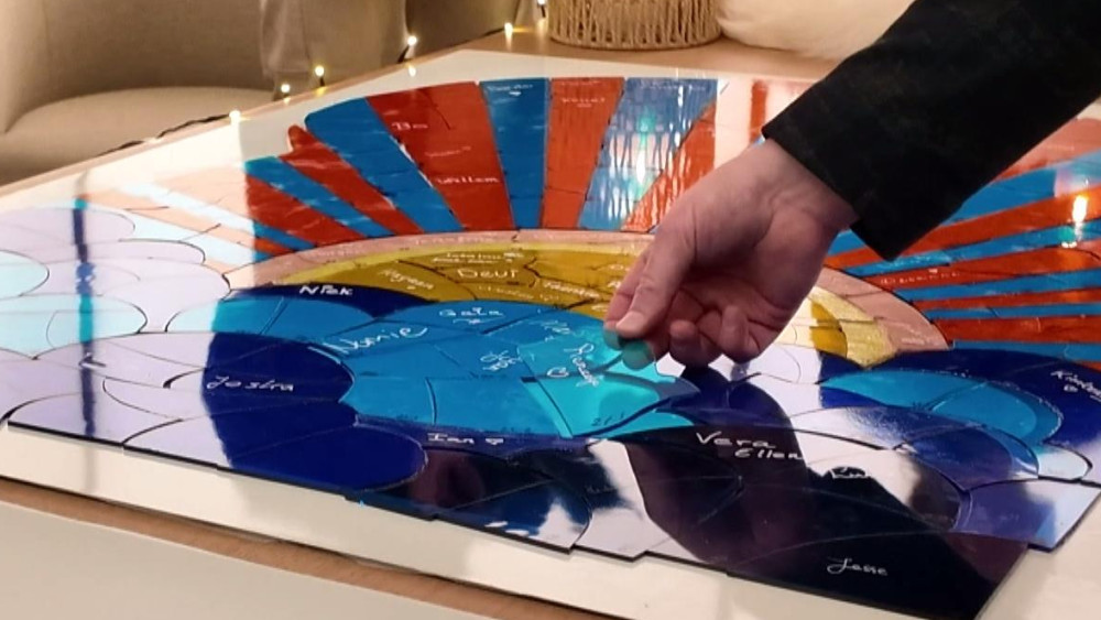 De Zaanse Cindy Krijgsman schrijft de naam Koen op een rood stuk glas. “Want dat was zijn lievelingskleur”, weet zijn vader Edward. De elfjarige Koen overleed, omdat hij geen weerstand had door een aangeboren stofwisselingsziekte. “Het is toch bijzonder dat we Koen weer kunnen vastleggen op een monument”, vindt Cindy.